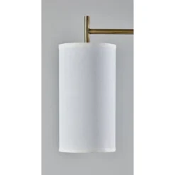 Stylishly illuminate any room with the mid-century modern design elements of the Zion floor lamp. The base and stand feature a monochrome antique brass finish and clean lines and angles. A long slender pole rises from the compact rectangular base and supports a short arm. Suspended from the arm is a tall drum shade made of white textured fabric that softly diffuses the light from a 100W bulb. The floor lamp is also available with a black metal finish and beige textured shade.