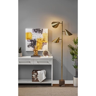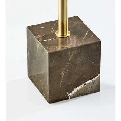 Bring mid-century modern style to your space with the Hawthorne tree lamp. Featuring a chunky cube-shaped base made of brown marble anchoring an antique brass pedestal and three offset shades, this floor lamp is both sleek and refined. And at 68″ tall and a mere 8″ deep, it is compact enough to be used in any area. It offers an articulation point at the joint of each curved cone-shaped shade, allowing you to direct the light wherever it’s needed. Operated by a rotary switch located on each of the three shades to easily turn the 40W bulbs (not included) on or off, this lamp also features a 5′ clear cord. Complete your space’s look with the coordinating Hawthorne desk lamp and Hawthorne floor lamp.